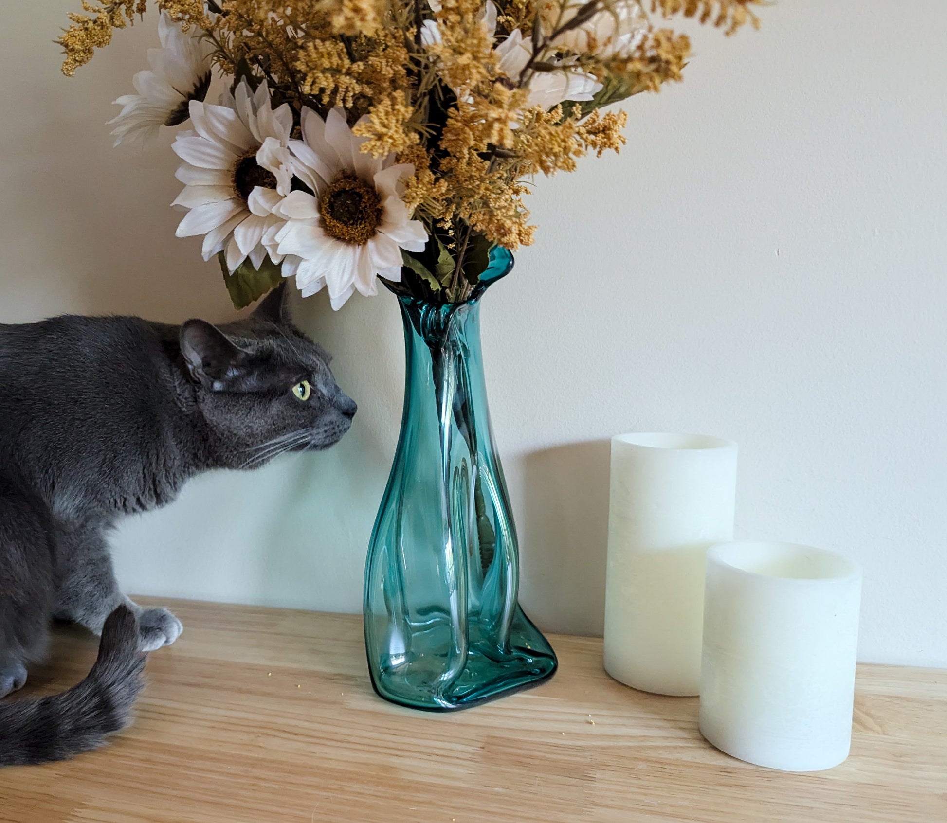 The Size: Each pouch vase that I make is an experiment and comes out unique, but all pouches are between 11” and 14” tall. I place rubber cabinet bumpers on the bottom so there is no fear of wobbling, slipping, or scratching a surface. If you are interested in a pouch outside of these measurements, please contact me through my commissions page.
